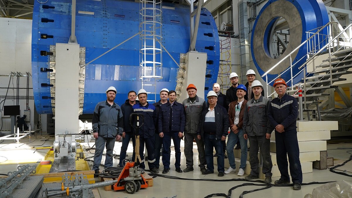 14 апреля в павильоне многоцелевого детектора MPD ускорительного комплекса NICA в Лаборатории физики высоких энергий ОИЯИ впервые прошло перемещение сверхпроводящего соленоида массой 800 тонн в текущей конфигурации. Также, неотъемлемо от соленоида, перемещена боковая платформа для электронного оборудования, предназначенного для считывания показаний с детекторов MPD. Перемещение потребовалось для решения задач монтажа электроники. Сейчас конфигурация включает в себя сам соленоид – огромный магнит диаметром более 5 метров, а также магнитопровод, куда он установлен, и верхнюю платформу, на которой уже частично смонтировано криогенное оборудование. Как пояснил начальник сектора инженерного обеспечения установки MPD ЛФВЭ ОИЯИ Александр Федюнин, отвечающий за подготовку платформы к монтажу, в конечном итоге она будет представлять собой полностью изолированное пространство. На каждом из четырех уровней платформы будут расположены по восемь стоек для электроники и электропитания и по четыре ко