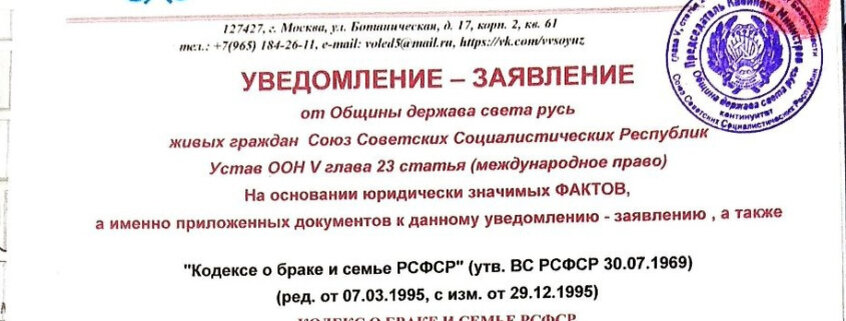 АРХИВ АРИЯ, ЗНАЧИМЫЕ ЮРИДИЧЕСКИЕ ФАКТЫ, ЛЕТОПИСЬ -СТАНОВЛЕНИЕ, УВЕДОМЛЕНИЯ ПАТРОНАЖ НАД ДЕТЬМИ УВЕДОМЛЕНИЕ – ЗАЯВЛЕНИЕ от Общины держава света русь живых граждан Союз Советских Социалистических Республик Устав ООН V глава 23 статья (международное право) На основании юридически значимых ФАКТОВ, а именно приложенных документов к данному уведомлению – заявлению , а также “Кодексе о браке и семье РСФСР” (утв. ВС РСФСР 30.07.1969) (ред. от 07.03.1995, с изм. от 29.12.1995) КОДЕКС О БРАКЕ И СЕМЬЕ РСФСР (в ред. Указов Президиума ВС РСФСР от 04.12.79, от 30.01.84, от 25.04.84, от 20.02.85, от 19.11.86, от 24.02.87, Федеральных законов от 22.12.94 N 73-ФЗ, от 07.03.95 N 28-ФЗ) Забота о советской семье, в которой гармонически сочетаются общественные и личные интересы граждан, является одной из важнейших задач Советского государства. В Советском Союзе, в состав которого входит на основе добровольного объединения и равноправия с другими союзными республиками Российская Советская Федеративная Социа