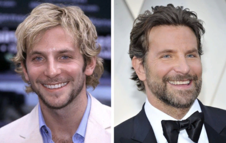 С момента своего дебюта актер Брэдли Купер сильно изменился! Если мы знали его блондином, с немного взлохмаченными волосами, а также с его одеждой (например, с расстегнутыми рубашками), то сегодня перед нами другой мужчина! Естественный цвет волос, всегда ухоженный и стилистически безупречный, он заменил свой прежний образ смокингом с галстуком-бабочкой.