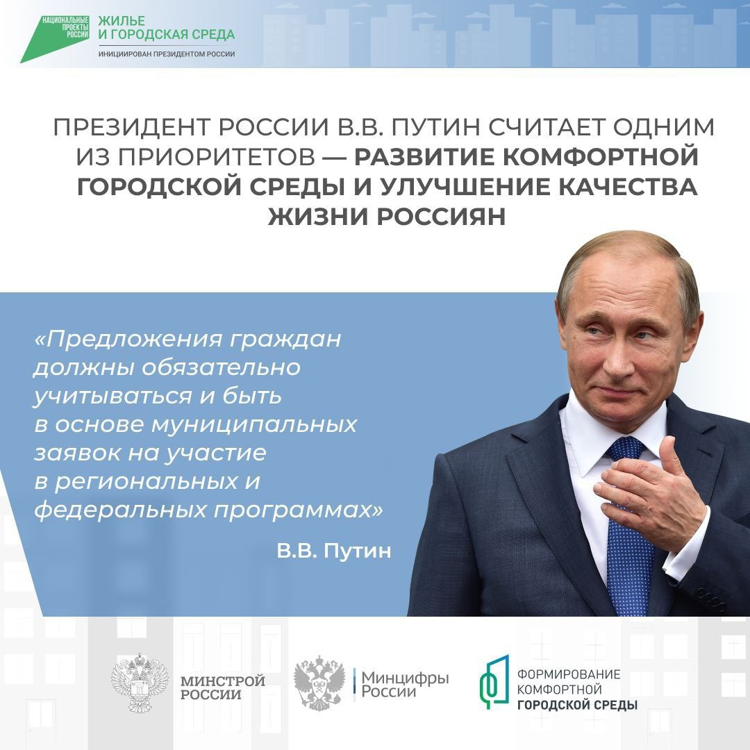 Президент России Владимир Путин уделяет особое внимание формированию комфортной городской среды в нашей стране. Проводятся заседания Совета по развитию местного самоуправления, проходят регулярные совещания по социально-экономическому развитию регионов, инициируются форумы. #КомфортнаяСреда