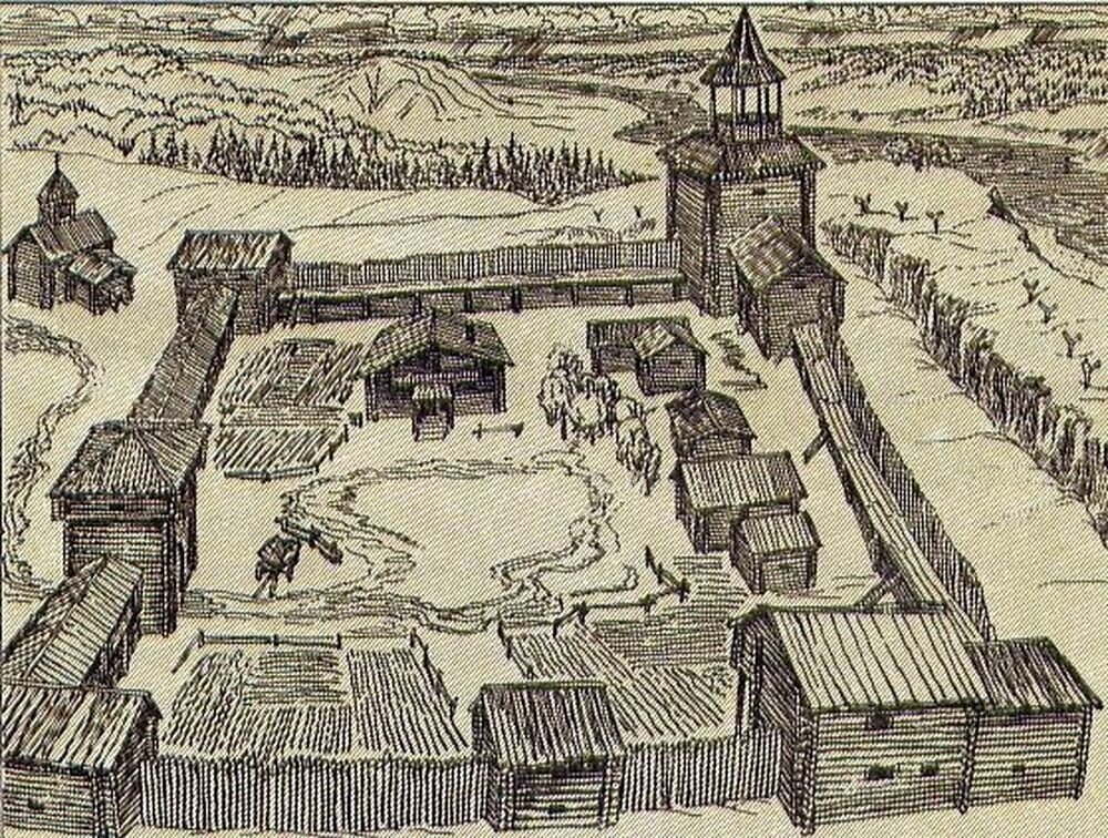 Острогом называли бревенчатый фортификационное сооружение, которое являлось либо постоянным, либо временным населённым укреплённым пунктом. Широкое распространение получил при покорении Сибири Ермаком Тимофеевичем. История возникновения. На Руси остроги появились приблизительно на рубеже 11-12 веков для обороны территории от кочевых народов. В 13 веке острогом назывался укреплённый пункт, обнесённый частоколом. Первые строились на скорую руку. В 14−17 веках аналогичные крепости распространились на южных рубежах Руси (к примеру, Самара в 1586 году, Царицын в 1589 году), а с конца 16 — начала 17 века — и на территории Сибири. Острог использовался при создании засечных черт в целях укрепления русских границ от потенциальных врагов. Были и другие значения у слова "острог". Например, острогом могли называть тюрьму либо военный лагерь обнесенный частоколом. Конструкция. Крепость была построена из бревенчатого тына и бревенчатых венцов. Стена находилась на ровной поверхности либо на вершине
