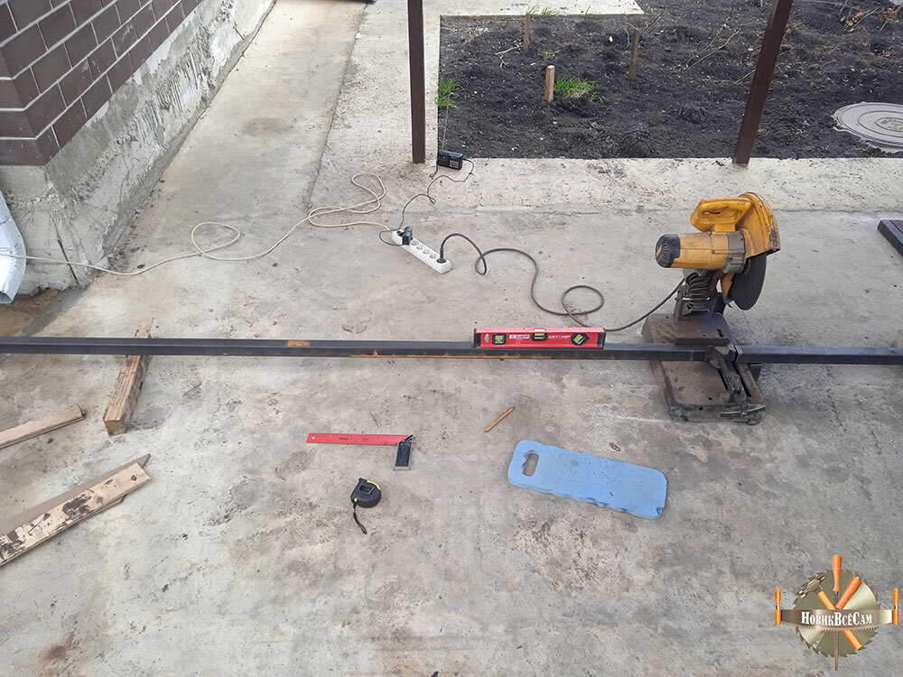 Для изготовления стульев на веранду использовал металлический профиль 4х4 см и 4х2 см. Из металлопрофиля длиной 6 м торцовочной пилой нарезал необходимое количество заготовок из расчета, что на один стул потребовалось из профиля 4х4 см: 87 см – 2 шт, 65 см – 2 шт, 52 см – 2 шт, 37 см – 4 шт, из профиля 2х4 см: 61 см – 2 шт. . Чтобы спил был ровным, применил уровень.