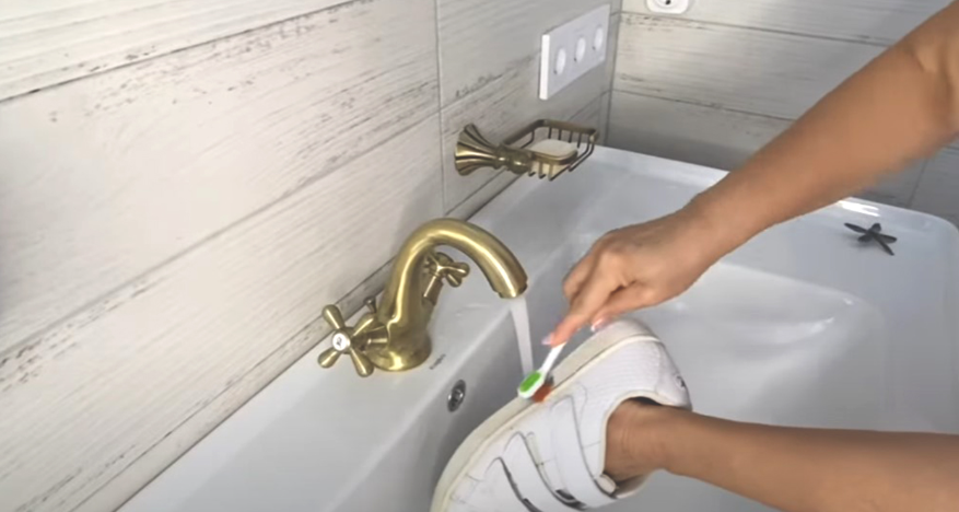 Подошва белой обуви тоже прекрасно чистится с помощью щётки и небольшого количества отбеливающей зубной пасты.