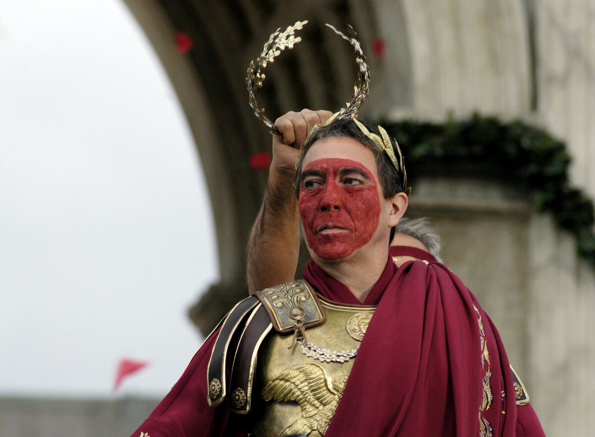 Во время грандиозного парада Триумфа, Триумфальный полководец носил тогу пикту и красил лицо в краску красного цвета. Красная краска на лице отожествляла полководца с Богом Войны (Марсом-отцом), а тога представляет власть. Сообщение, которое здесь передается, довольно очевидно.