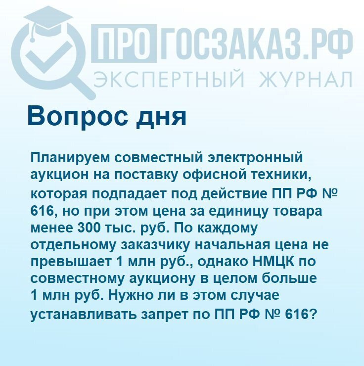 Планируем совместный электронный аукцион на поставку офисной техники, которая подпадает под действие ПП РФ № 616, но при этом цена за единицу товара менее 300 тыс. руб. По каждому отдельному заказчику начальная цена не превышает 1 млн руб., однако НМЦК по совместному аукциону в целом больше 1 млн руб. Нужно ли в этом случае устанавливать запрет по ПП РФ № 616?