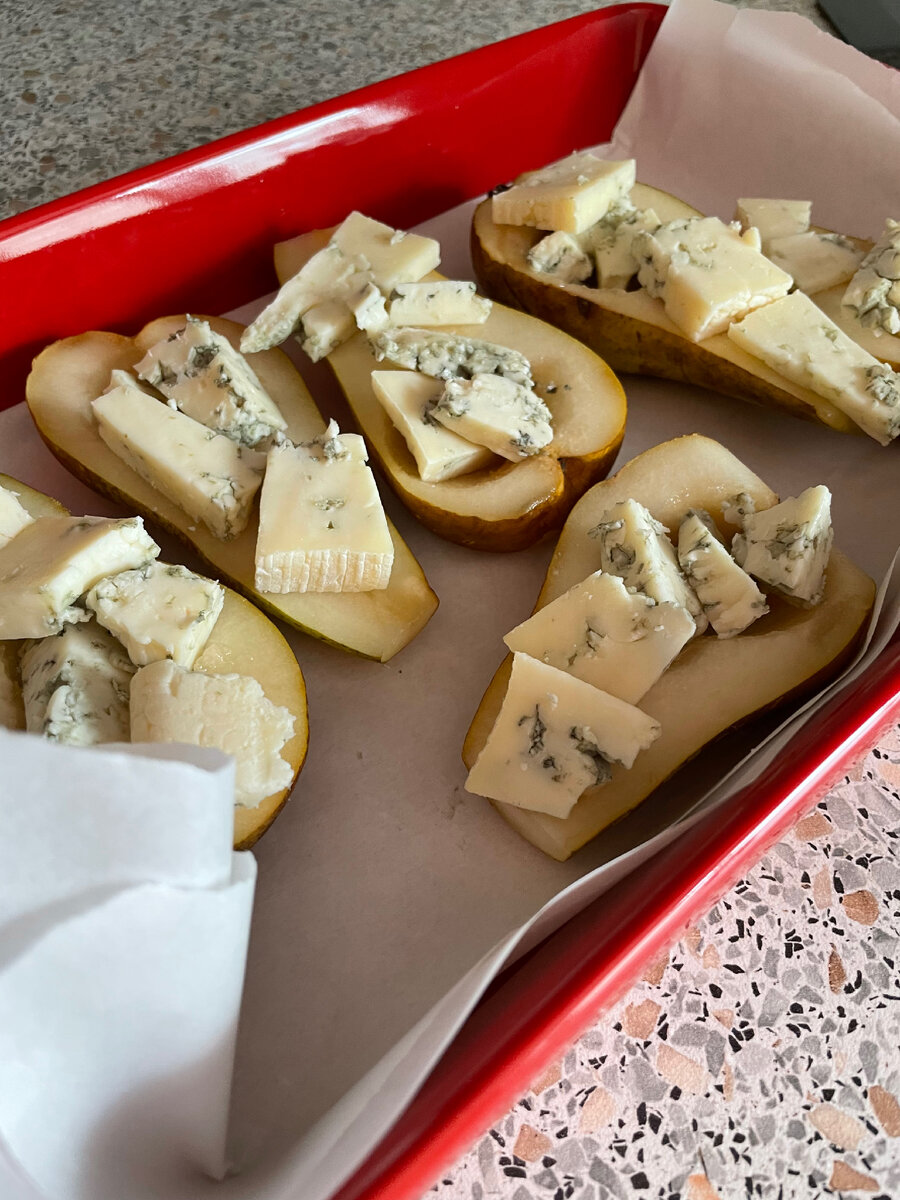 Гостей на пороге не было, а душа требовала праздника. Как тут откажешь… Аккурат возле кастрюли с депрессивной картошкой лежал он – сыр с благородной голубой плесенью. Я хотела уничтожить его под бокал игристого, уж очень мне нравится, но сыр стал жертвой кулинарных подвигов. Рецепт подкинула мне сестра, а ей знакомая, а знакомой ее знакомая… сарафанный маркетинг он такой. По мимо названного сыра с голубой плесенью нам понадобится груша «конференция», не одна, лучше три, и мед. Сыр нарезаем. Груши делим пополам, убираем из них сердцевину, и укладываем в форму для запекания форму, разумеется, застилаем пергаментной бумагой, если нет желания потом отмывать ее от сыра Груши в форму загрузили, сыр на них разложили, а сверху поливаем все это дело медом. Кто-то скажет сначала нужно мед, а потом сыр – их право, но до меня дошла такая вариация рецепта. Форму с нашими полуфабрикатами отправляем в духовку, разогретую до 180 градусов и забываем на 15-20 минут. За это время неприглядные