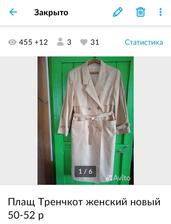 Наступило время плащей. Видимо, на них сейчас высокий спрос. Такие выводы я сделала, продав мамин женский тренчкот за первый час выставления данного лота. История этого плаща удивительна. Мама его купила в 1989 году. Сшит тренчкот в Астрахани, качественная ткань. Одним словом, винтаж. Модель очень актуальна в наше время. Мама ни разу не надела этот плащ за все эти годы. Говорит, не ее цвет. Плащ висел у неё в шкафу. А я ищу, что бы мне ещё продать сезонное. С разрешения мамы выставила на продажу. Цену поставила всего 990 рублей: обнаружила с изнаночной стороны плаща какие-то небольшие пятна. В описании указала все нюансы. Столько просмотров было! Даже, когда товар был зарезервирован, многие хотели купить, несмотря на эти пятна. Вот вечера получила оплату. Плащ отправила Авито доставкой в Москву. Так что смотрите у себя, что у вас есть из сезонных вещей и выставляйте на продажу. Всем быстрых и удачных продаж!