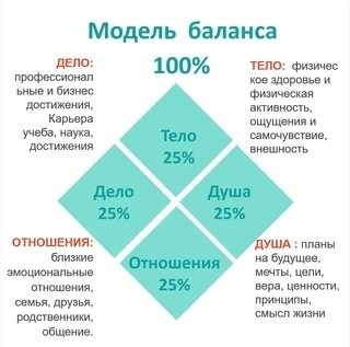 Данная модель пришла к нам из позитивной психологии и согласно ей - вся наша жизнь условно разделена на четыре сферы: -тело/здоровье, -дело/достижения, -отношения/общение, -душа/будущее/мечты. Модель баланса можно применять в своей жизни, чтобы определить, что в ней сейчас происходит и что необходимо изменить 👇 Инструкция: Рисуем модель баланса и 100% своей энергии ( времени) распределяем по этим четырем сферам. Если энергия (время) распределены в соотношении около 25% на каждую сферу, то сферы жизни сбалансированы. Если больше или меньше в какой-то из сфер - значит есть перекос и баланс нарушен. Для гармоничной и счастливой жизни необходимо равномерно распределять свою жизненную активность (энергию) между всеми сферами жизни. Иначе сфера, которой недостаточно внимания, неожиданно для самого человека - сделает это сама, в виде возникшей проблемы, конфликта. Желаю вам баланса и гармонии во всех сферах жизни ! 🏵🏵🏵 Мой Телеграм Понравилась статья, ставьте лайк и подписывайтесь на ка
