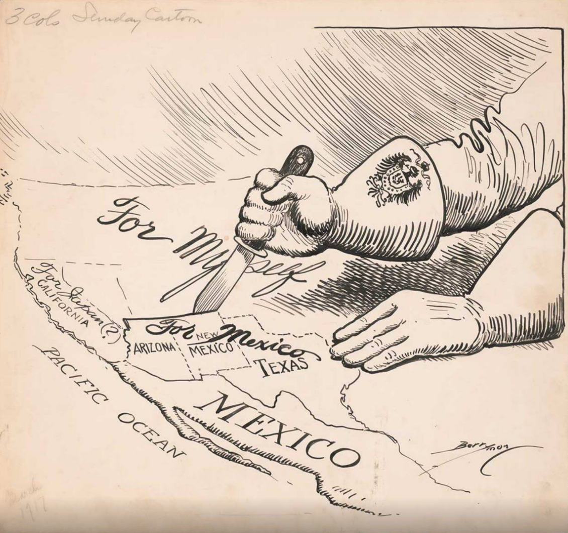 С 1915 г. пошли разговоры о том, не следует ли США напрямую вступить в войну на стороне Антанты. Дело в том, что Германия начала «неограниченную подводную войну» – все корабли, даже нейтральные, оказавшиеся у побережья Великобритании, подлежали беспощадному потоплению. Тем самым немцы планировали уморить англичан голодом и вынудить тех пойти на мир. Естественным образом «неограниченная подводная война» била по американским коммерческим интересам, не говоря уже о гибели амер