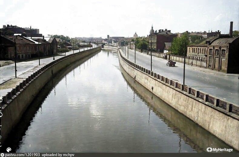 1) Вид от Высокояузского моста в сторону Москвы-реки 1940 год Яузу обводнили и заключили в камень. Исторически у реки не было каменных набережных, только естественные берега. Патриархальный колорит Москвы с этим изменением исчез. Вообще, вдоль Яузы до революции обычно строили производства, теперь идет тенденция на застройку промзон элитным жильем. 2) Застройка у подножия Швивой горки, где ныне стоит высотка на Котельнической набережной 1945 год Редкий кадр, который позволяет нам увидеть дома, которые стояли у Яузы до постройки сталинской высотки. Видно, что это были небольшие двухэтажные дома. Если приглядеться, то виден забор, значит скоро дома пойдут на слом. 3) Москворецкая набережная 1940 год Многих удивит этот кадр. Да, Китайгородская стена в районе Зарядья стояла чуть ли не до 1950-х годов. Даже башни оставались! Были даже предложения построить сталинскую высотку в Зарядье без сноса стен. Но и высотку не построили, и стены снесли. 4) Cтанция метро "Кропоткинская" 1947 год 5) Рек