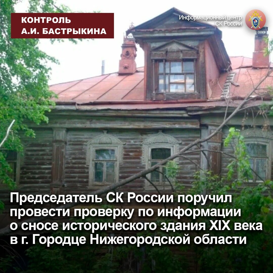 Председатель СК России поручил провести проверку по информации о сносе исторического здания XIX века в г. Городце Нижегородской области