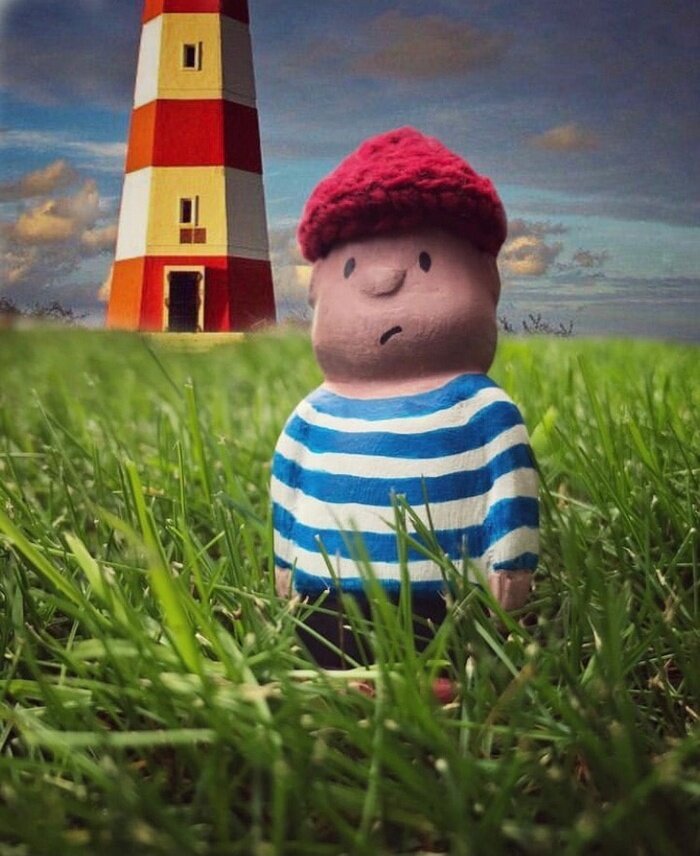 Примерно полтора года назад на свет появилась моя первая фигурка из дерева - это был смотритель маяка по имени Йохан. Я так собой гордилась, когда без всяких обучающих видео просто взяла и воплотила в реальность персонажа из моей фантазии! Но со временем я в нем очень разочаровалась, т.к. с наработкой опыта начала видеть изъяны первой работы: слишком примитивная форма, полностью покрыт краской и поэтому вообще не понятно, что он сделан из дерева, да и расписан корявенько (например, у меня были трудности с оттенком лица, поэтому там не один и даже не два слоя краски, которая со временем приобрела синюшный оттенок). Шапочка была связана из каких-то старых и не очень красных ниток.. В общем, было принято решение обновить персонажа (примерно, как в кино меняют актера в новом сезоне). Вот так и появился этот паренёк. Я по-прежнему горжусь собой за то, с чего я начинала, но наконец-то Йохан будет таким, каким я его видела изначально. Йохан успел застать снежную сибирскую весну, поэтому сразу