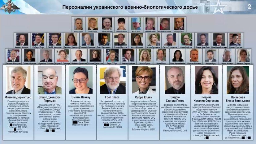 Министерство обороны России назвало новые имена американцев и украинцев, причастных к военным биологическим программам Пентагона на Украине. С докладом об этом выступил начальник войск радиационной, химической и биологической защиты ВС России генерал-лейтенант Игорь Кириллов. Список фигурантов пополнил Элиот Джейкобс Перлман — руководитель НПО «Международный институт проблем ВИЧ и туберкулёза» в Киеве. Он участвовал в создании лабораторной базы для проведения военно-биологических исследований на Украине. Профессор Института новых патогенов при Университете штата Флорида Грег Гласс изучал распространение возбудителя туляремии на Украине, он привлекался к реализации проекта «Ю-Пи-8» (Распространение вирусов конго-крымской геморрагической лихорадки и хантавирусов на Украине). Профессор молекулярной микробиологии и иммунологии в Школе общественного здравоохранения при Университете Джонса Хопкинса Эндрю Стэнли Пекос привлекался в качестве одного из ведущих консультантов к проекту «Ю-Пи-2»