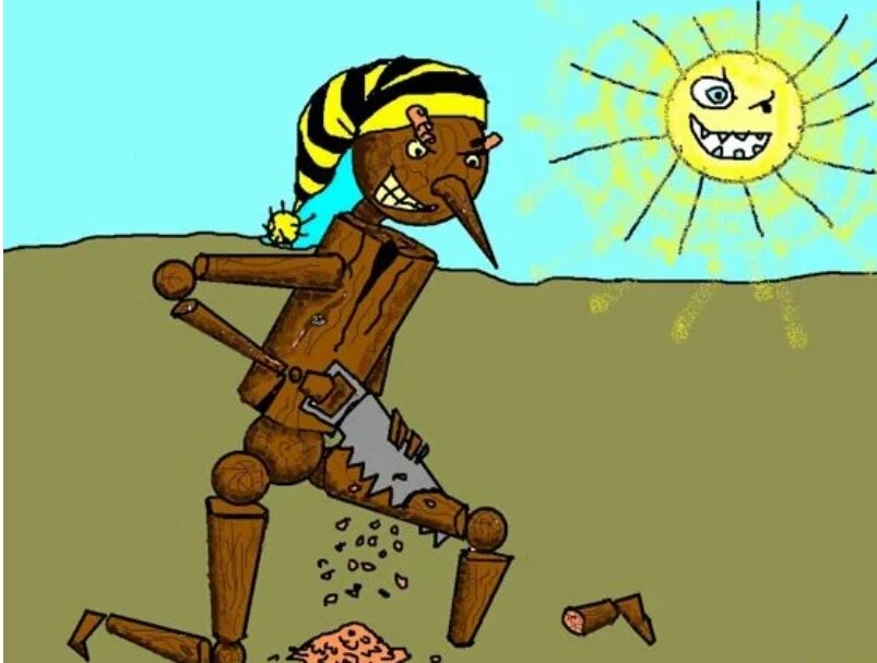 Вдалеке, средь узких улиц, Где петух чехвостил куриц. Домик старенький стоял, С виду буд то сеновал. . Папа Карло жил в том доме, Месяц как отчалил с зоны. Жил без бабы, сам с собой, Плюнул на руку , и в бой. . С виду , вроде адекват, Но, немного тепловат. За топор любил хвататься И чего-то порубать. . Вот сидит перед камином, Рубит топором дровину. Та , не колется, пищит, Словно что то говорит. . Мужичёк сперва не въехал, Думал всё, крышняк поехал. В Красно-Белое сгонял, И стопарик засосал. . Закусил! Ещё накинул. Сразу стало веселей. А ему пищит полено. -Эй! Ушлёпок! Мне налей. . -Это чё блин за подстава!? Папа Карло заскулил. И за сук схватив дровину, Заметнул её в камин! . А-я-яй! Полено взвыло. Чё ты делаешь ? Урод! Щас сгорю, спасай тварюга! Я шатал твой дымоход! . -Ну ! Быстрей! - Визжит полено. С ручника снимись, козёл. Доставай меня скорее, Глянь! Дымок уже пошёл! . Деревяшка затрещала, Вся объятая огнём. Ну а Карло кочергою, Как дровину хвостанёт! . Тот, со свистом из камина