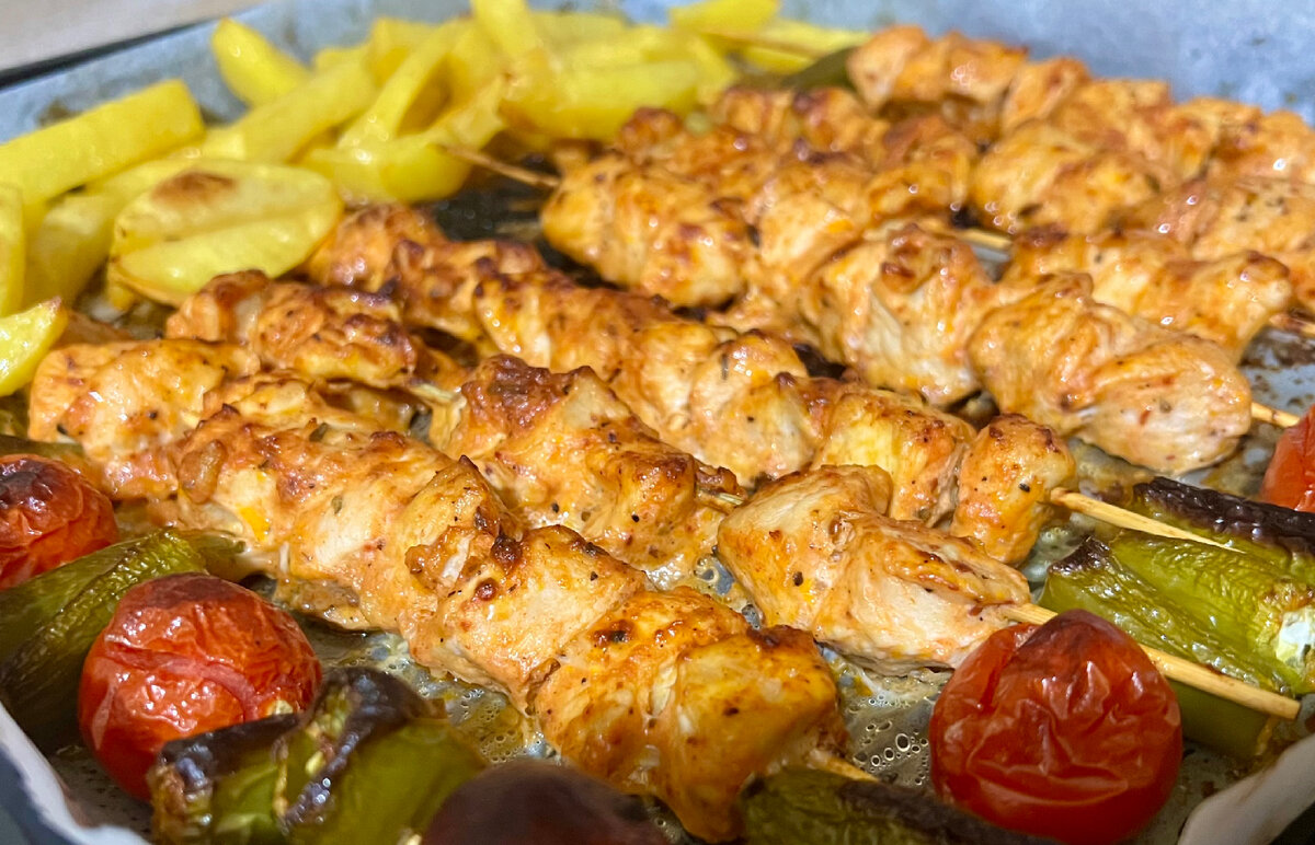 По данному рецепту куриная грудка будет сочной, мягкой и ароматной. Ингредиенты, необходимые для приготовления: Приступаем к приготовлению: Куриную грудку хорошо промываем и удаляем всю лишнюю влагу при помощи бумажного полотенца. Грудку разрезаем на одинаковые квадратики, чтобы удобно было насаживать на шпажки. Делаем маринад: В глубокой емкости смешиваем: подсолнечное масло, греческий йогурт, томатную пасту, чеснок, соль и сладкий красный перец, также можете добавить свои любимые приправы. Перекладываем грудку, хорошо перемешиваем и оставляем мариноваться в течении 1-2 часов. Тем временем очищаем картофель и нарезаем палочками, как на картофель фри. Перцы промываем, достаем середину и делим на равные части, соединяем с помидорами черри, солим и перчим по вкусу. Приступаем к сборке. На шпажки нанизываем замаринованные кусочки куриной грудки, и выкладываем их на противень застеленный пергаментной бумагой. Распределяем картофель. Помидоры черри и перец также нанизываем на шпажки