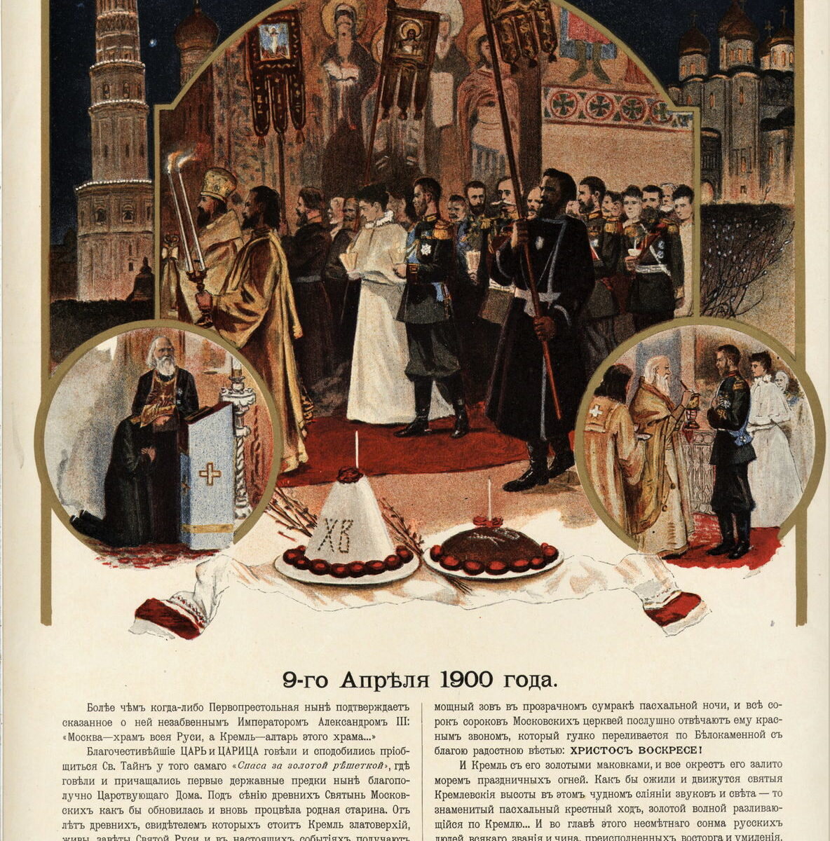 Пасха при дворе императоров являла зрелище незабываемое. Весь двор и вся городская знать собирались в этот день во дворцовой церкви, которая была полна народом. Дворцовая площадь была сплошь заставлена самыми изящными экипажами, дворец утопал в великолепии: недаром народ в то время представлял его себе раем. В ночь на пасхальное воскресенье, во втором часу пополуночи начиналось великолепное шествие по парадным залам дворца в Большую церковь для слушания всенощного бдения. Блистательный кортеж открывали придворные чины, затем следовали царское семейство и гости. В этот день дамы являлись ко двору в придворном русском платье, а кавалеры - в цветных праздничных кафтанах. Кульминационные моменты пасхального богослужения - начало заутрени, пение "Христос Воскресе", чтение Евангелия - сопровождались залпами пушек близлежащих Петропавловской и Адмиралтейской крепостей. 101 выстрел возвещал об окончании литургии. Церкви города наполняли тишину Святой ночи благовестом колоколов.