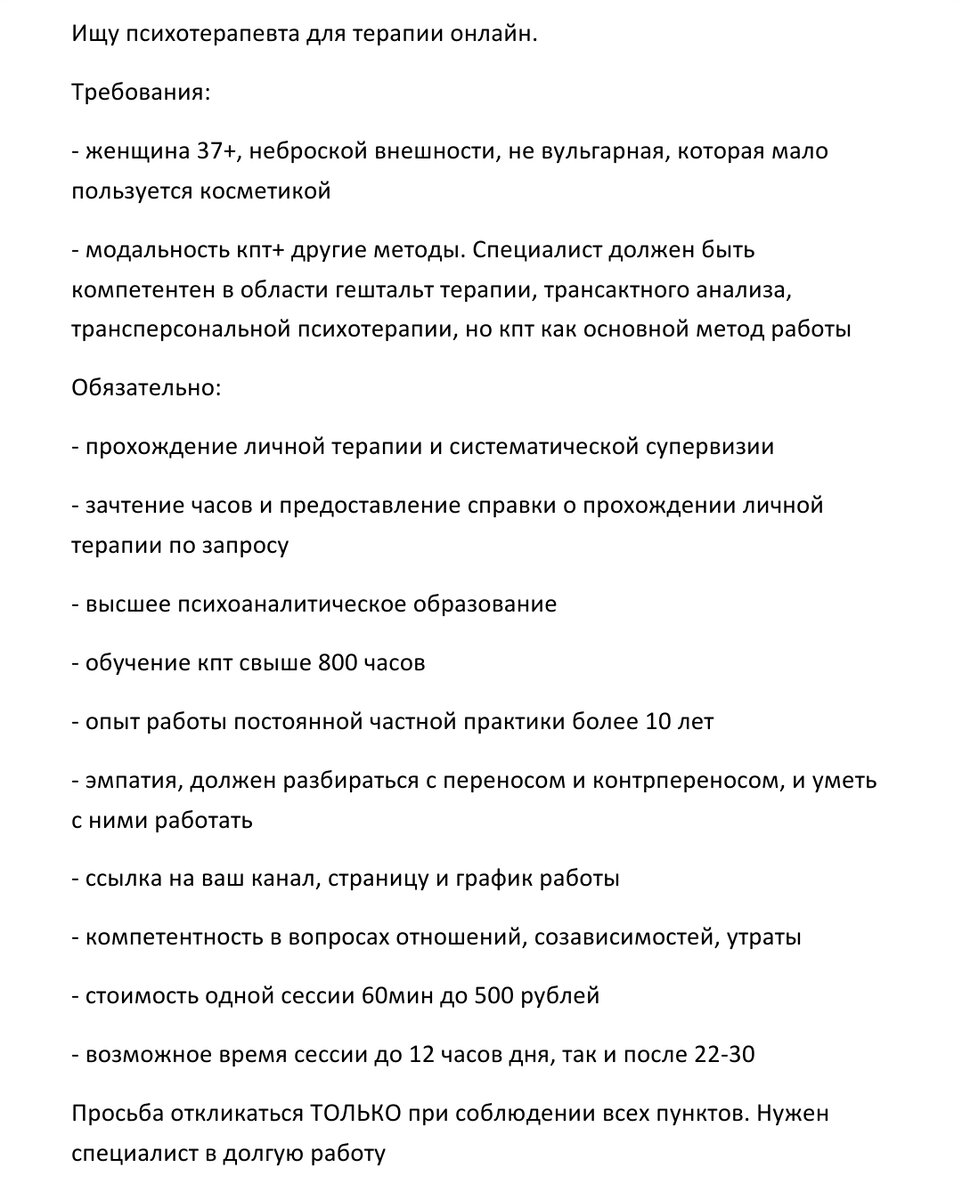 Уже не в первый раз натыкаюсь на такие объявления в интернете Я еще когда работала в другой сфере, поняла один важный принцип.❗Тот, кто меньше всего заказывает, требует от вас больше всего и при этом никогда не остается благодарен и доволен❗ Честно говоря, после всех прочитанных требований, думала, что оплата не ниже 7-8 т.р/час🙄. Из этого объявления понятно следующее мета-сообщение: «Я выем тебе мозги за 500 ₽, уважаемый психотерапевт». Ирония в том, что с самого начала происходит реверсия ролей. Ни один именитый психолог / психотерапевт / психиатр не будет идти на поводу у человека, который к нему обращается (только потому что так хочет последний). Сама суть психотерапии заключается в том, что терапевт выставляет определенные рамки / границы, которых пациенту / клиенту необходимо придерживаться. Любое отклонение от этих рамок - ценный материал для исследования в терапии (это показатель жизни клиента). Также психоаналитики со стажем работают в зоне своих интересов (то есть, ск