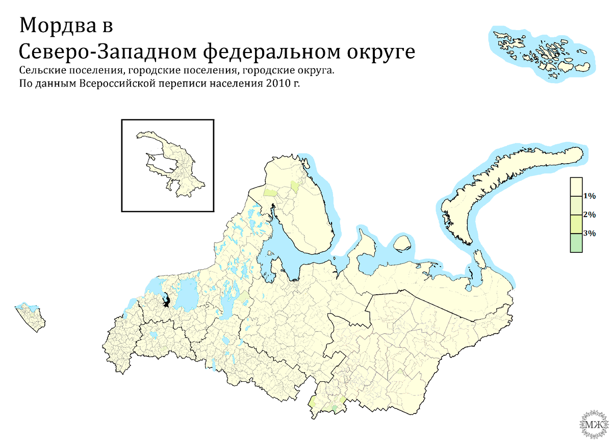 Оригиналы изображений с полным размером и без вотермарок доступны на Бусти за две недели до выхода новой работы. Очередная общероссийская карта расселения народов, теперь это мордва. Снова напоминаю, что мордву я отдельно уже обозревал по округам в ПФО, СФО и ЦФО. Обычно недостающие округа я отображаю здесь, потому сначала рассмотрим их, вне зависимости от значительности присутствия там данного этноса. На европейском севере мордвы совсем нет. Долю в более чем 3% формируют в одном из сельских поселений всего 3 представителя мордвы. Юг уже несколько поинтереснее. Мог бы быть, поскольку мордовские поселения там фиксировались ещё на картах имперских времён. Выделяющиеся же здесь 5% к этому отношения не имеют, мордва здесь живёт в хуторах Чиганаки 1-е и 2-е, постепенно ассимилируясь среди живущих там русских и турок. За Уралом мордвы не мало. Но было и больше. Мордва участвовала в формировании оренбуржских казаков на территории современной Челябинской области, а также участвовала в столыпин