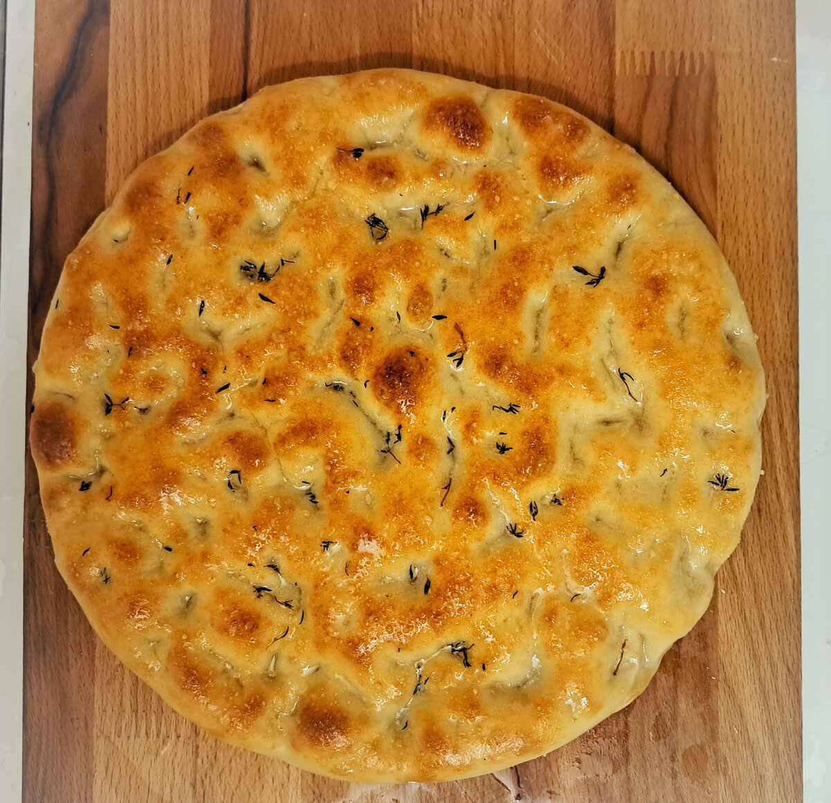 Фокачча. Этот дрожжевой итальянский хлеб незаменим. Его подают к праздничному столу с прошутто в качестве аперитива, и в будни, как к завтраку, так и для любого другого приема пищи. Приготовление фокаччи очень простое, не нужно даже скалку использовать, все делаем руками. В каждом регионе Италии трансформируется внешний вид - начинка и форма (круг или квадрат). Начнем с круглой, ее проще растягивать руками. Ингредиенты. *пара веточек тимьяна (у меня всегда есть замороженный, он не меняет свойств и быстро размораживается, не меняя форму) Для эмульсии: Все, кроме эмульсии я закладываю в хлебопечку и ставлю режим тесто (1,5ч). Всё! Вынимаем, на раскаточный коврик выливаем 1 ст л масла, выкладываем тесто, складываем пополам, приминаем, снова пополам, приминаем (не давим, аккуратно, чтобы пузырьки не лопнули), третий раз складываем, слегка вытягивая. Формируем шар. форму смазываем маслом, распределяем пальцами тесто по форме, аккуратно, не растягивая, ставим на 40 минут в духовку, чтобы те