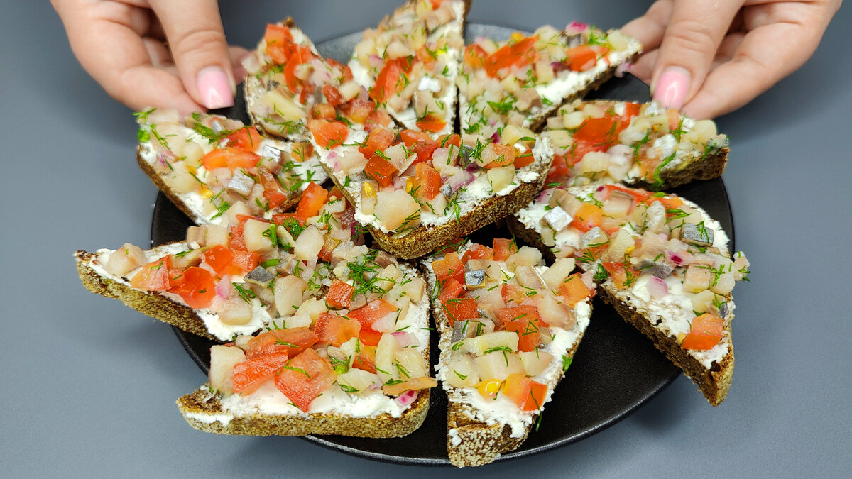 Приветствую вас на канале "Карамелька"! Сегодня хочу поделится невероятно вкусными и простыми в приготовлении бутербродами. Такие бутерброды стали неотъемлемой частью наших семейных застолий, да и со стола всегда улетают одни из первых. Приступим к приготовлению! 📌Для приготовления нам понадобятся следующие продукты: Способ приготовления: ✅Черный хлеб нарезаем на порционные кусочки и слегка подсушиваем с двух сторон на сковороде или в тосте. ✅Салатный лук нарезаем мелкими кубиками. Я обязательно мариную лук для этих бутербродов, чтобы убрать горечь, но по желанию можно этот пункт пропустить. ✅Лук отправляем в небольшую миску добавляем уксус 9% и заливаем кипятком, как только вода остынет лук замариновался. ✅Филе сельди нарезаем очень мелкими кубиками. ✅У помидора срезаем верхнюю часть без мякоти и нарезаем мелкими кубиками, а мякоть убираем в сторону (я ее потом добавляю в зажарку). ✅Укроп нарезаем очень мелко и смешиваем все подготовленные ингредиенты. ✅На кусочки подготовленного х