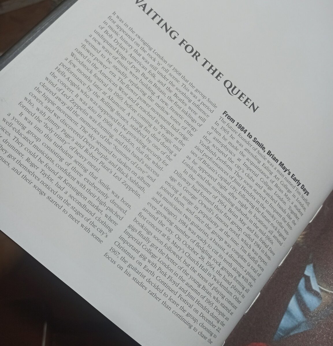 Избранные фрагменты из книги на мой вкус. Самая первая глава называется "В ожидании Queen". Сначала вольный перевод, потом мои замечания. "Именно в свингующем Лондоне в 1968 году на рок-сцене впервые появилась группа Smile. В это период музыка все еще находилась под умиротворяющим влиянием музыки Боба Дилана и американского фолка. Beatles все еще оставались неоспоримыми поп-королями. Но в Британии нарастала новая музыкальная волна. Ее новаторская мощная энергия медленно, но верно замещала ласкающие слух тона музыки эпохи "детей цветов". Движение культуры хиппи зародилось на американском Западе, достигло апогея ко времени фестиваля в Вудстоке в 1969, и подошло к своему трагическом концу за пару месяцев до Альтамонта. Молодой фанат был зарезан одним их Ангелов Ада, который, как оказалось, должен был обеспечивать безопасность во время фестиваля. Тогда же в 1968 году в Лондоне зародился смерx по имени Led Zeppelin. Успех этой группы смысл последние воспоминания о "Лете Любви"и движении хи