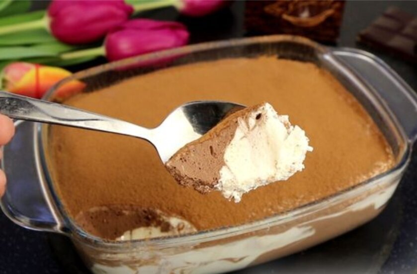 Ингредиенты : Сметана (жирностью от 25%) - 600 г Сахарная пудра - 110 г Желатин - 15 г Вода - 75 г Какао-порошок - 25 г (+ для украшения) Ванилин - 1 щепотка Рецепт: Шаг №1 Желатин соединяю с водой, перемешиваю и оставляю для набухания. шаг №2 К сметане добавляю сахарную пудру и ванилин, немножко перемешиваю, чтобы пудра не летала по всей кухне. шаг №3 Взбиваю сметану с сахарной пудрой с помощью миксера до пышности и лёгкого побеления. Также сметана немножко увеличится в объеме. На средней скорости миксера это 7-8 минут. Но аккуратно, не перевзбейте. шаг №4 Набухший желатин растапливаю в микроволновке. Добавляю к желатину несколько ложек сметаны, перемешиваю. Соединяю с основной массой и взбиваю миксером до однородности. шаг №5 Взбитую сметану делю на 2 равные части - по 400 г. шаг №6 Добавляю в одну часть какао. Вернее, будет проще сначала в какао добавить несколько ложек сметаны, перемешать до однородности, а затем соединить всё. Хорошо перемешиваю. шаг №7 Если во время п
