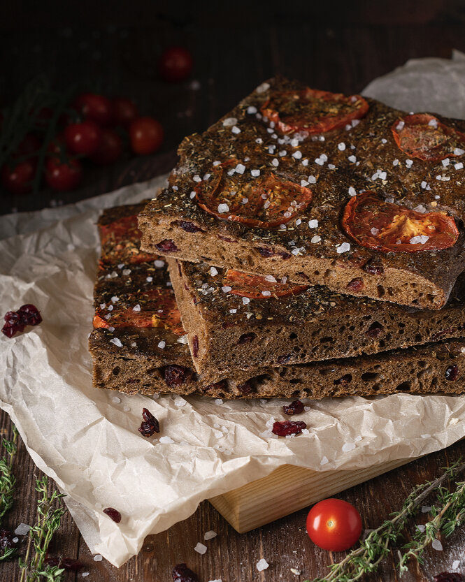 Наша Фокачча Итальянская лепешка длительной ферментации на закваске с добавлением томата, розмарина, морской соли, оливкового масла и клюквы. Выпекается в печи с каменным подом. Focaccia считается одним из главных национальных итальянских блюд. Состав: мука пшеничная, красный солод, клюква вяленая, томат, розмарин, морская соль, оливковое масло, пшеничная закваска, соль, патока карамельная, вода. Жиры:0,7; Углеводы:59,3; Белки:6,8; Калории:269,3 на 100 гр.