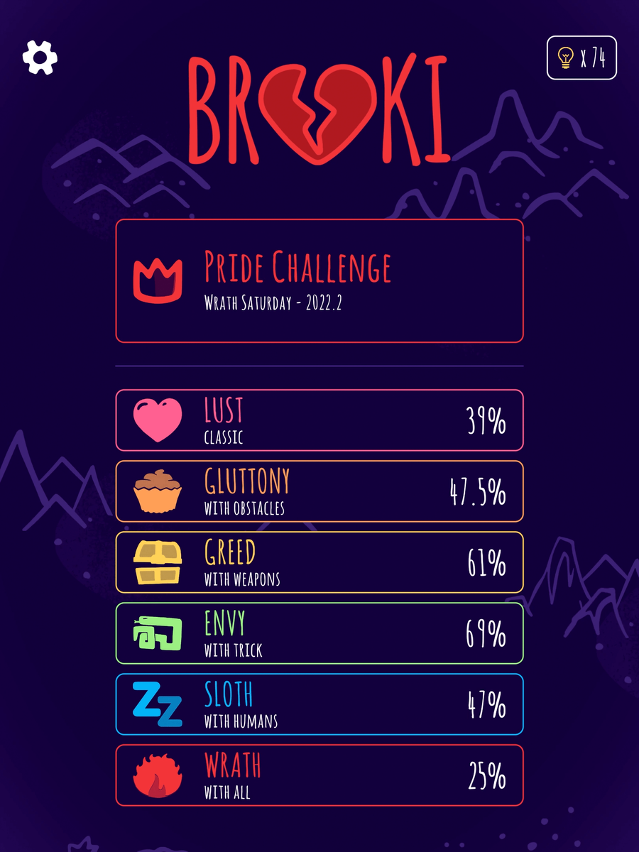 Broki — это нетривиальная головоломка для Android и iOS, в которой мы будем давить представителей нечисти фигурками из тетриса. Помимо увлекательного геймплея, игра получила оригинальный дизайн, качественное графическое оформление в рисованном исполнении, скромную анимацию и приятное музыкальное сопровождение. В главном меню нас ждет шесть режимов игрового процесса со своими нюансами: Lust, Gluttony, Greed, Envy, Sloth и Wrath. И каждый режим включает в себя по две сотни уникальных заданий. Разумеется, с регулярно растущим уровнем сложности. Кроме того, имеется вкладка "Челлендж", где каждый день можно будет обнаружить новую головоломку в дополнение ко всем имеющимся. Смысл игрового процесса заключается в ликвидации демонят. Перед запуском первой головоломки в любом из шести режимов дается краткое пояснение, но если вы не дружите с английским, узнать о нюансах геймплея получится только из этого обзора. Итак, в каждом новом уровне на экране появляется небольшое разлинованное поле. На не