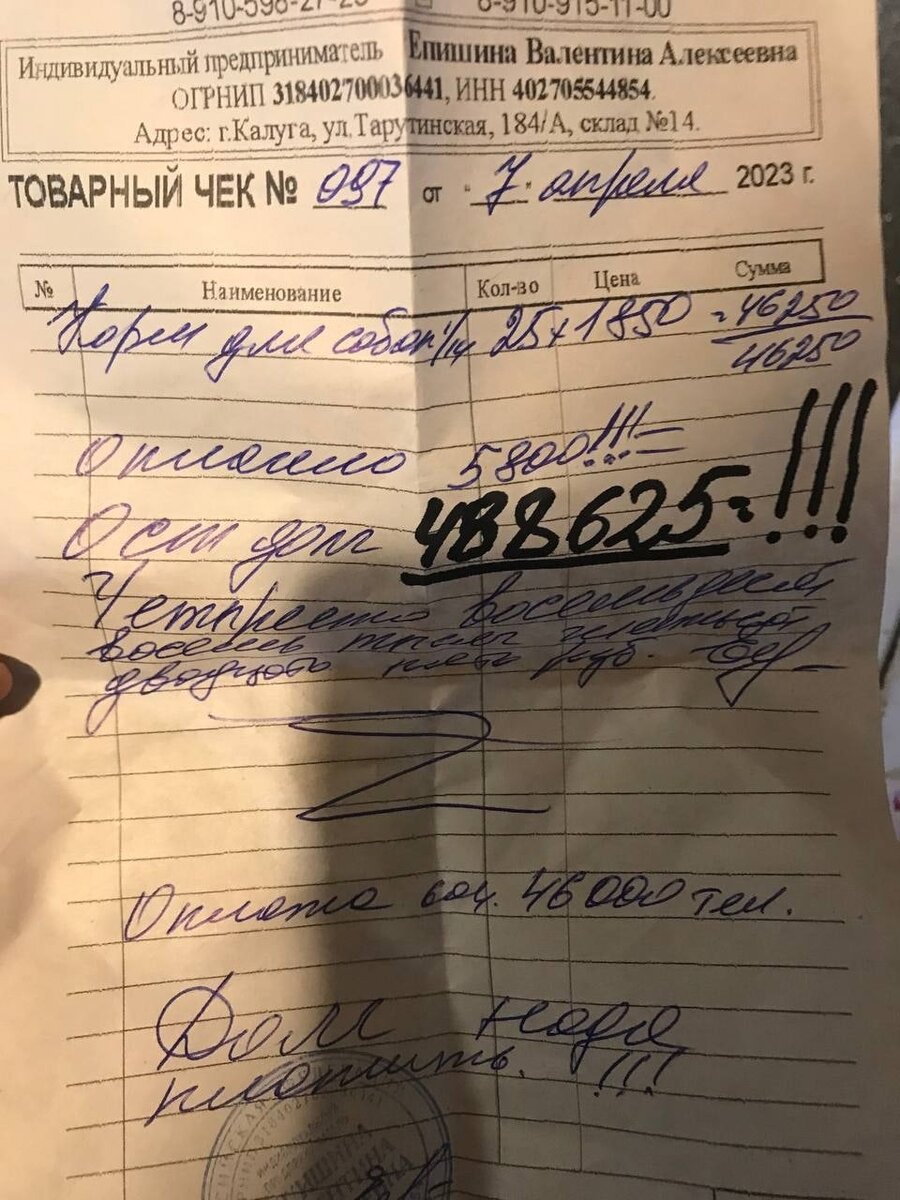 Чтобы нам начать собирать на переезд нужно погасить НЕПОСИЛЬНЫЙ для приюта долг за еду. Корм мы берем на базе. Цена мешка 1850 руб. Живем одним днем ,еле сводим концы с концами. Удается собрать за весь день только на один день еды это 46 тысяч. Каши варить нет возможности пока (после переезда начнем) т к нет плит,газовых баллонов и людей..