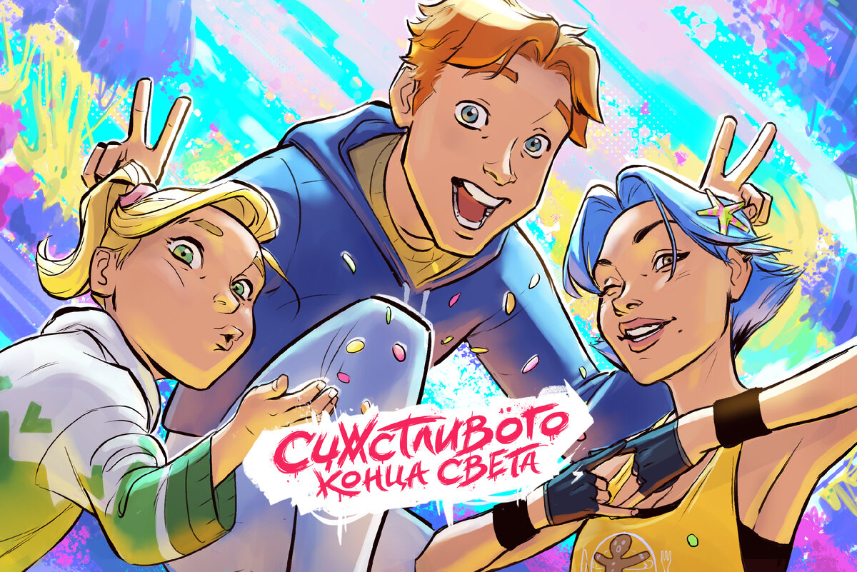 С чего начать знакомство со «Счастливыми Концами Света»! [ О ЧЁМ КОМИКС/КНИГА "Счастливого Конца Света"? ] Это комедийная история о трёх персонажах (Оливер, Софи и Аманда), у каждого из которых свои тараканы. Вместе они отправляются в непредсказуемое приключение по опасному миру, который сходит с ума от еженедельных концов света: землетрясения, зомби, гигантские тигровые креветки, мраглины, гаргульи, кислотные лавины, аномальные зоны, и это только начало… У каждого из них своя цель, но вместе с тем, они ищут своё место в этом новом мире, заводят друзей, пытаются понять себя, сражаются с монстрами, бездельничают, дурачатся и слушают музыку, ненадолго забывая об апокалипсисах. Аманда хочет вернуться к родителям, Софи пытается спасти похищенную сестру, а Оливер ещё не знает, чего он хочет от этой жизни, но, когда их пути пересекаются в Бриггертоне, они понимают, что дальше им придётся держаться вместе, чтобы положить конец бесконечным концам света. Ух ты! Если тебе хватило сил прочитать д