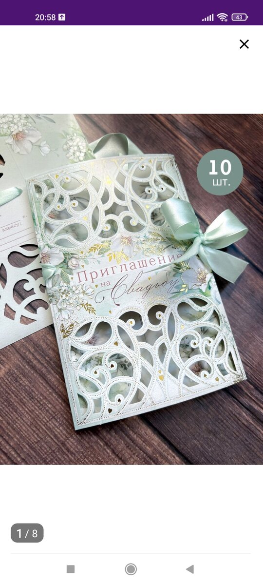 Добрый солнечный денёк вам, дорогие мои читатели. Поговорим сегодня о моей предстоящей свадьбе. А с чего начинается свадьба, конечно с приглашений, то есть с пригласительных. Я решила не тратить время на беготню по типографиям, заказам, ожиданиям печати и присмотрелась к готовым пригласительным на современных маркетплейсах. Во первых, они тоже очень прелестные. Во вторых, не надо тратить время и куда то ехать. В третьих, что очень меня удивило, даже там есть заказные именные пригласительные, на которых напечатать можно, что угодно вашей душе. Просто при заказе, надо написать продавцу, что именно вы хотите там увидеть. Какую дату например, какое время или какие имена у жениха и невесты. Посмотрим с вами то, ято мне понравилось. И выберем вместе. Муж согласовал всё то, что я вам покажу, но конкретно пальцем не ткнул на что то одно. А, да, забыла сказать, я всё ещё худею и без срывов! Итак, начнём. Вот первое пригласительное, которое мне понравилось. С ленточкой и резной первой странич