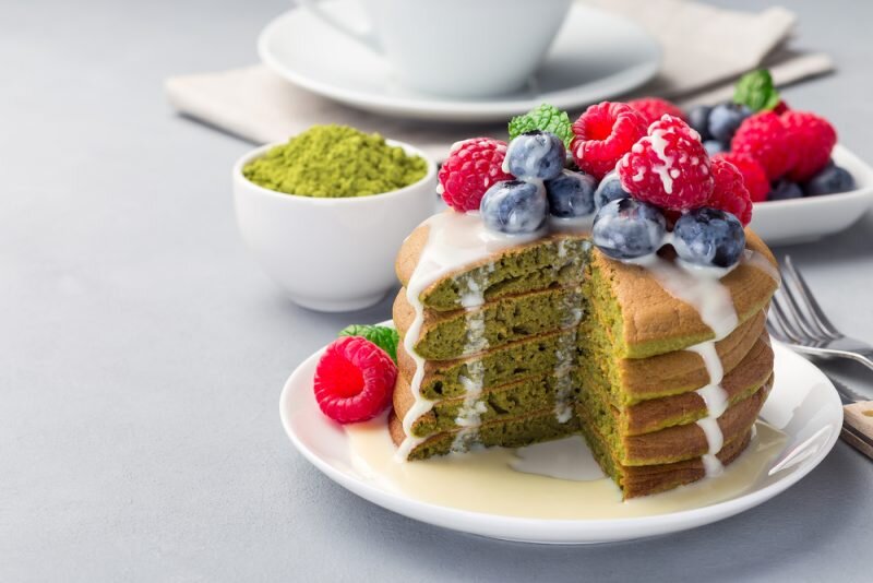 - Готовые панкейки выложите на тарелку, посыпьте матча, добавьте ягоды или мёд, грецкие орехи, пекан.