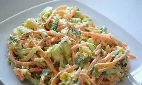 Ингридиенты: Сыр твердый - 100 граммов, потереть на крупной терке; грудка куриная копченая - 300 граммов порезать кубиком. Пару больших свежих огурцов, граммов на 300, порезать кубиком и напоследок - кладем в салат 200 граммов морковки по-корейски. Перемешать все, можно добавить кукурузу консервированную, но необязательно.