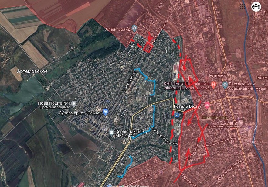 На окраинах Богдановки и Ор-Вас продолжаются бои. В самом городе тоже – и бои тяжелые. Если ранее сообщалось о боях западнее ж-д ст. Бахмут-1, то вчера: «В центре города «оркестранты» вышли к ж/д вокзалу». Поэтому по-прежнему считаю бессмысленным отслеживать улицу за улицей, очищенной от нечисти. Другое дело, что сопротивление пр-ка здесь давно уже лишено здравого смысла, но когда будет отдан приказ об отступлении, можно лишь гадать.