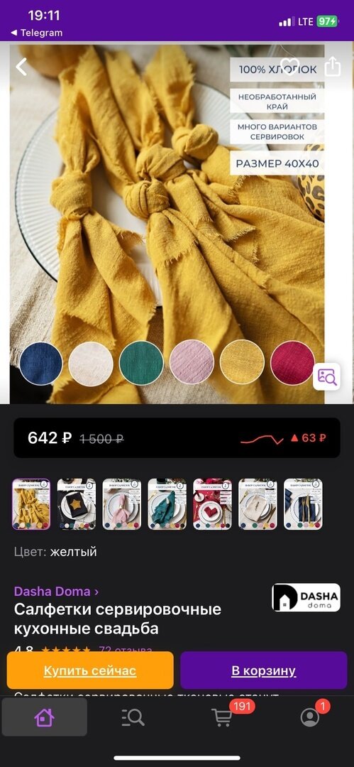 Как-то вечером, просматривая WB в поисках подходящего декора на праздничный стол, я нашла идеальные салфетки! "Боги мои, это то, что нам надо!" - подумала я. Как порядочный пользователь WB, я, конечно, перерыла все комментарии. Ну всем они идеальны, только вот смутил меня следующий отзыв: Так, теперь мы знаем, что необработанные края при машинной стирке у этих салфеток распускаются. Хм... в мою голову закрались сомнения. А так ли они идеальны!? Вместе с сомнениями пришла "большая зеленая жаба" и начала меня душить. Не хотелось мне отдавать 650+ руб. за 4 салфетки. Изучая вопросы к данному товару, мы обнаружили такой вопросик пользователя: "А не муслин ли это часом?". И тут пришла гениальная идея! Муслин! Купили мы, значит, метр очаровательного муслина (ширина ткани 135 см), конечно же, похожего цвета. Обошлась нам эта затея не более 400 руб. Итого, мы имеем 6 салфеток с необработанным краем, размером 40*40 см. Считаю вполне не дурно! Кстати, учитывая опыт из отзыва, салфетки с необраб