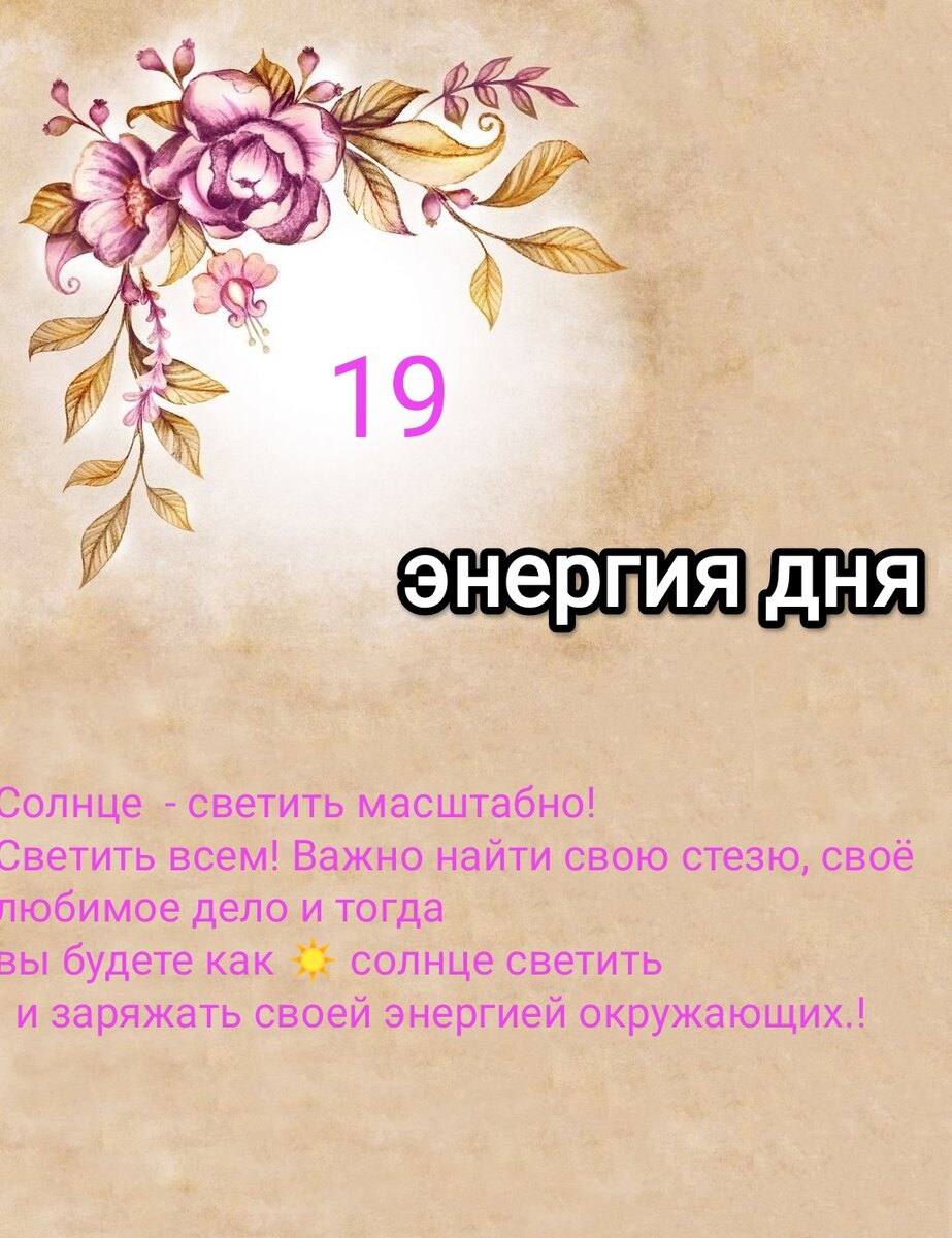 Каждый новый день -новая энергия. Знания энергии дня помогают нам прожить свой день незабываемо. Сегодня день под влиянием энергии Солнца -день яркий, насыщенный на эмоции,общение с детьми . Позвольте себе побыть ребенком- веселиться , дурачиться, заниматься тем ,чем хочешь и дарить радость окружающим.