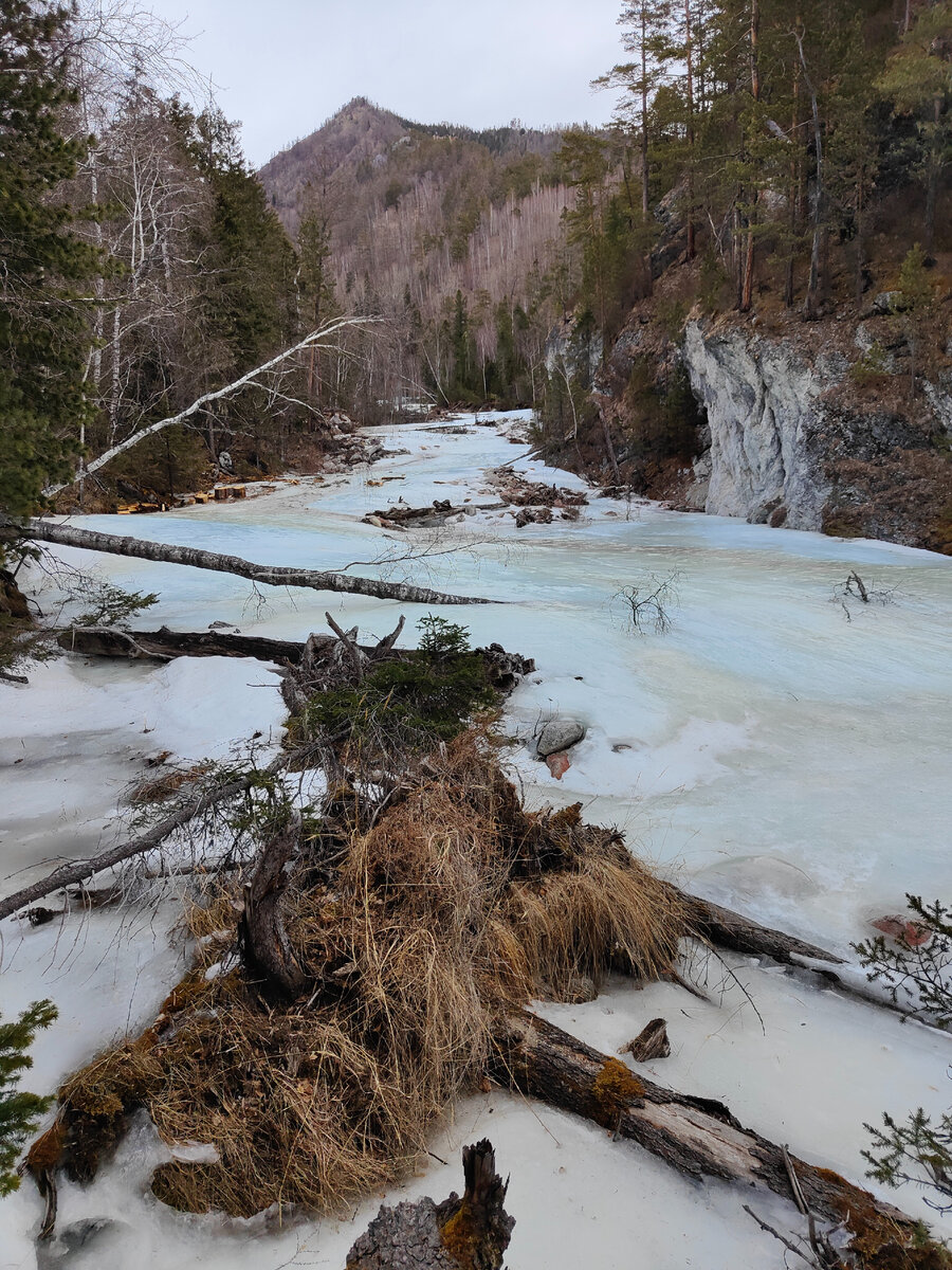 Наступила весна, а это значит, что можно начинать возобновлять восхождения! Так как зима получилась не очень активная на походы и другую пешую активность, мы решили выбрать маршрут, как нам рассказывали, попроще, но новый для нас. Выбор пал на одну из вершин недалеко от поселка Аршан - пик Галина (2198м). Проснувшись достаточно поздно (около 7 утра), плотно позавтракав и собравшись, мы начали наше приключение в 9 утра. На машине смогли подъехать практически вплотную к реке Бухота, вдоль которой и пролегал запланированный маршрут. Маршрут оказался с сюрпризом. Река была покрыта идеально чистым и гладким льдом и летняя тропа, проходящая вдоль реки по крутым прижимам, тоже оказалась заледенелой. Было скользко, а кошек у нас не было... Это оказалось нашей самой большой ошибкой. Из-за сложности тропы, скорость была минимальная, поэтому вместо часа пути по реке, мы шли добрые 2 часа, смотря как все остальные туристы спокойно пробегают мимо нас по реке в кошках... Затем на развилке с тропой