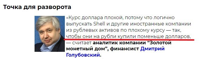 В последнее время мы видим множество публикаций, в которых госчиновники, а также отечественные и зарубежные финансисты пытаются найти оправдания причины столь заметного снижения курса рубля в последние дни. Например, министр финансов России Антон Силуанов наговорил на эту тему что-то абстрактное и невнятное: Агенство Блумберг объяснило падение рубля высоким спросом на валюту со стороны зарубежных компаний, продающих и выводящих свои активы из России, в частности, речь шла о компании Shell: Но дальше всех в своих объяснениях зашел финансовый аналитик Дмитрий Голубовский. Он пояснил, что курс рубля опустили специально, чтобы Shell и другие зарубежные компании вышли из рублевых активов по невыгодному курсу! Дословно: "чтобы они на рубли купили поменьше долларов". Это "логично", - считает аналитик. Супер! Получается, по мнению аналитика, чтобы "насолить" Shell и другим западным компаниям, нужно в очередной раз сделать всех россиян беднее, ведь такой рост курса точно не останется незамеченн