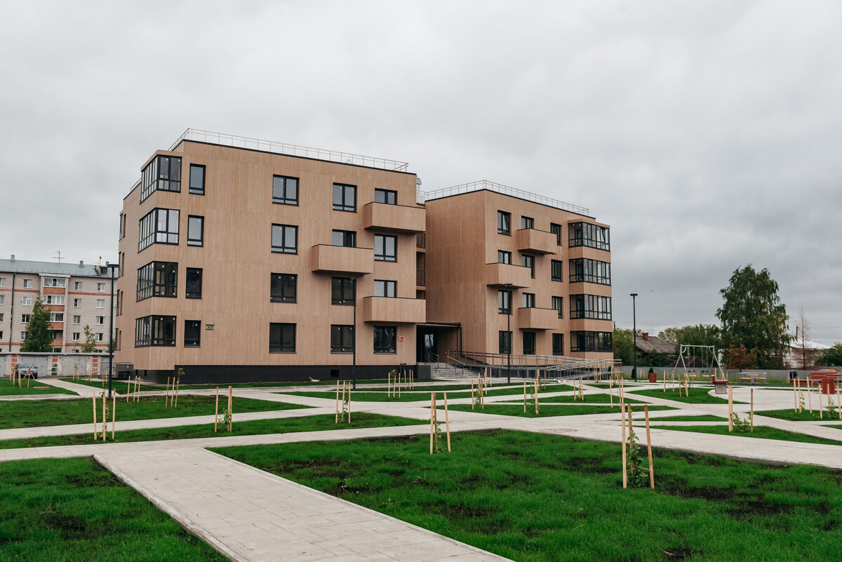 В 2022 году в городе Сокол Вологодской области построили многоэтажный жилой дом из CLT-панелей. Здание в ЖК «Соколики» высотой в 15 местров вместило 32 однокомнатные и двухкомнатные площадью 48 до 65 кв. м. Проект разработали в Segezha Group. Панели CLT (Cross-Laminated Timber) сделаны из перекрестноклееной древесины выдерживают большие нагрузки и устойчивы к деформации. Их используются для стен, перекрытий, ограждений балконов, и это экологически чистые материалы. Стены квартир обшиты гипсокартоном, чтобы соответствовать противопожарным нормам (деревянные конструкции должны быть закрыты со всех сторон). В мире уже есть подобные проекты, даже более высокие здания. Например, в Ванкувере есть деревянное 18-этажное здание для студентов университета провинции Британская Колумбия. А технология появилась 30 лет назад в Австрии и Германии. В России деревянное многоэтажное домостроение было запрещено до 2019, года Минстрой принял новые правила (раньше можно было построить деревянный дом до т