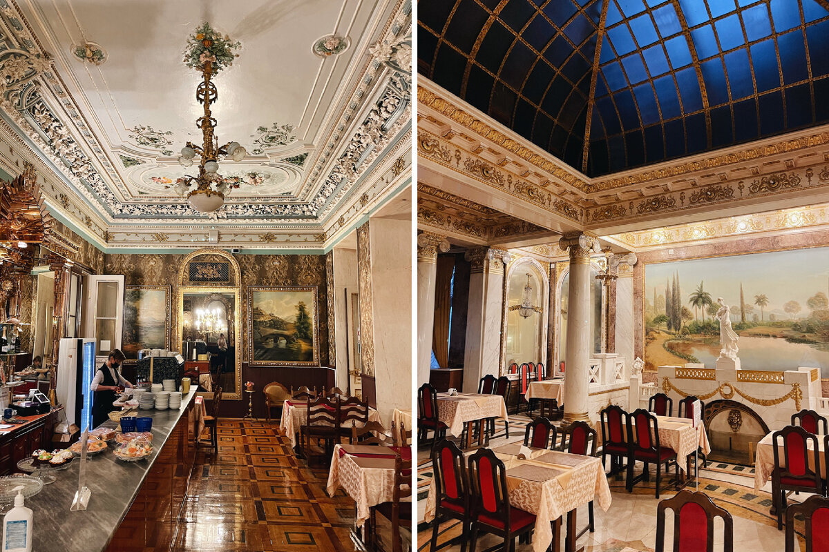 Венецианское стекло, зеркала, скульптуры, колонны — все это сохранилось до наших дней. И все это можно увидеть бесплатно. Как вы заметили по фотографиям, в парадной столовой бывают как пустые столы, так и полная посадка — это зависит от времени. Работает столовая для всех желающих только в будни с 12.00 до 15.30. Чтобы успеть застать выбор блюд, приходите к началу обеда, в 14.00 останется один салат, один суп и один гарнир. А чтобы рассмотреть интерьеры без очередей, заглядывайте, наоборот, к закрытию, когда комплексный обед уже разберут.