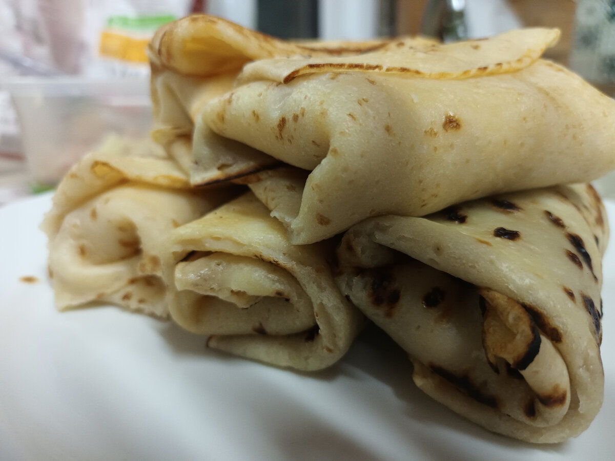 Дорогие друзья! Этот рецепт подойдёт для быстрого завтрака, так как на его приготовление уходит всего 15 минут. Ингредиенты очень простые. Для теста: молоко, вода, мука, сода, соль, сахар и растительное масло; а для начинки просто сыр и ветчина. Начнём с теста, берем 500 мл молока, 300 гр муки, 2 столовых ложки сахара и 1 растительного масла, щепотка соли и соды. Все это мы помещаем в тару, в которой будем взбивать. Взбиваем до того момента, когда тесто будет однородным и пузырьчатым. Оно должно получится не очень жидким, но и не густым, как на оладушки. Оставляем тесто на минут 15 и начинаем резать ветчину кубиками и после набираем сыр на крупной тёрке, потом все это смешиваем в одной ёмкости. Оставляем начинку, берем сковороду, у меня специально для блинов. Хорошо накаляем её и смазывать кисточкой растительным маслом, наливаем тесто и распределяем его, наклоняя сковороду, чтоб был красивый круг. Жарим с двух сторон до красивой золотой поверхности. Такую процедуру проводим со все