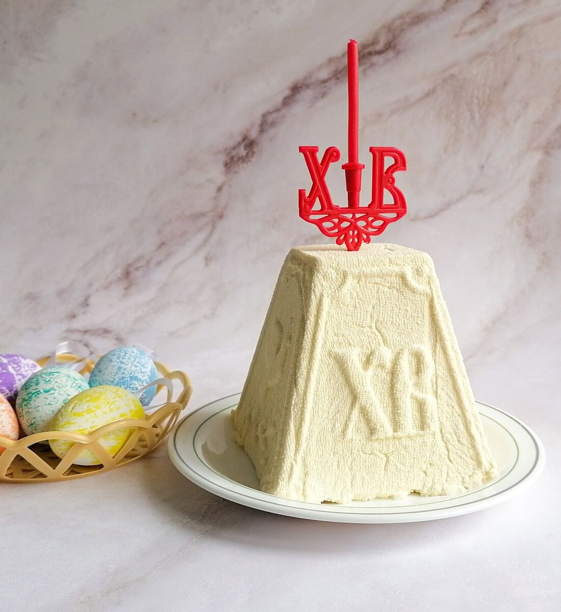 В пасочницу выложить мокрую марлю, и выложить творожную массу, разровнять. Убрать в холодильник под пресс на сутки. Ингредиенты: 500 г творога (9%)