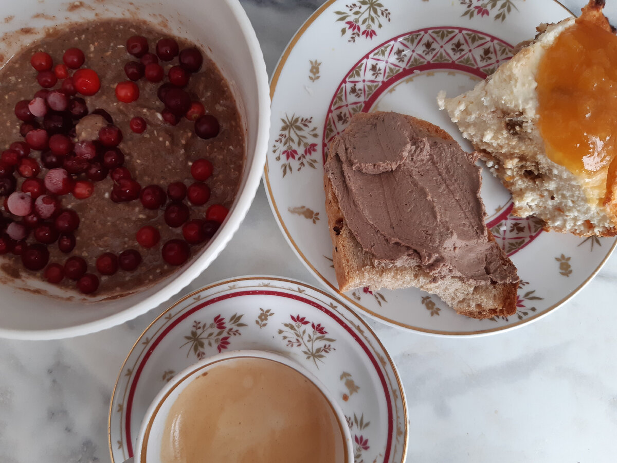 Четвертый месяц продолжается наш с вами марафон - питаемся на 5500 руб в месяц на человека (в феврале это было 5000 руб). Получается скромная сумма в 178 руб на человека в день. О запасах на начало месяца можно почитать ЗДЕСЬ, а также проводим ЗАПАСОПОЕДАТЕЛЬНЫЙ МАРАФОН Закупка продуктов №1 - Вкусвилл, Лента, Светофор Закупка продуктов №2 -Вкусвилл, Дикси, Чижик Закупка продуктов №3 -Вкусвилл, Озон, Дикси, Верный, КБ, Метро Все рецепты можно найти в КАТАЛОГЕ РЕЦЕПТОВ Сегодня у нас снова завтрак-конструктор -просто собрала все, что уже было готово или готовится быстро. Льняная шоколадная каша с брусникой (только залить кипятком), творожная запеканка с курагой (из морозилки, достала с вечера). К запеканке -нектариновый джем. Бутерброды с печеночным паштетом. Все домашнего приготовления - и хлеб, и паштет, и запеканка, и джем. Совсем закончились фрукты и овощи, поэтому заказала сегодня доставку в Перекрестке. На обед ели гороховый суп и бутерброды с печеночным паштетом. Кофейный переку