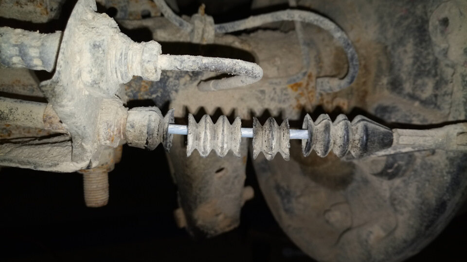 О качестве ульяновских резинотехнических изделий многие знают не понаслышке. Точнее, о его полнейшем отсутствии. Гофры дверей я уже заменил, дошёл черёд и до гармошек тросов ручника. Разумеется, их состояние, ввиду месторасположения, было ещё хуже: классическая нарезка из колечек, которые некогда (но очень недолго) составляли единое целое. Брать точно такую же сажу, чтобы через полгода снова увидеть решето, смысла ровно никакого. Альтернативное решение нашёл на популярном форуме. Покупается гофра проводки от десятки-сарая (21113724195) и нахлобучивается на трос заместо оригинальной туалетной бумаги. Причём нахлобучивается так удачно, что за счёт Г-образной формы полностью закрывает от грязи непосредственно сочленение трос-скоба. Из минусов — с другой стороны её приходится крепить к кронштейну троса принудительно. Для этого я применил веками проверенное решение, а именно чёрные атмосферостойкие стяжки. Одна утягивает конец гофры, две другие притягивают эту "удавку" к гайке на кронштейне