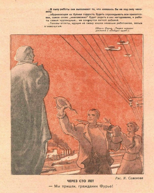 Рисунок Ивана Семёнова (1906—1982). «Через сто лет. — Мы пришли, гражданин Фурье!». 1938 год
