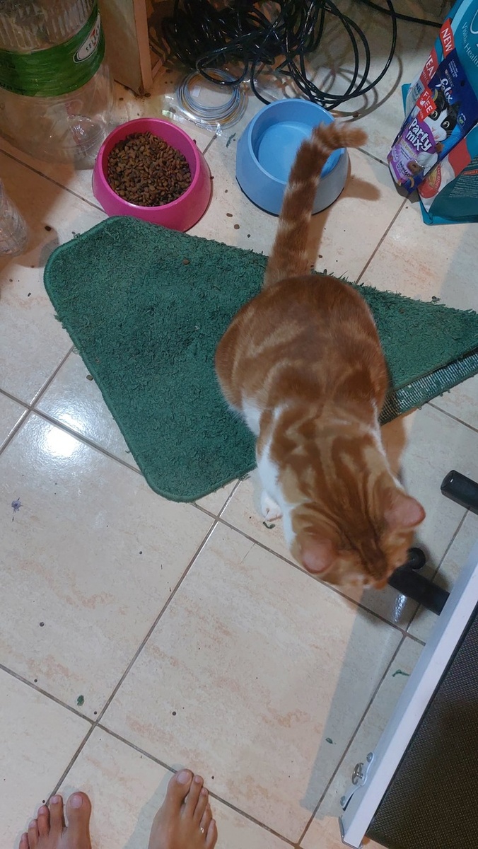 За это время кот притащил его к своим мискам. Стало понятно что эти миграции вытиралки для ног были не результатом рандомного тыгыдыка, а целенаправленными попытками кота постелить себе "скатерть".