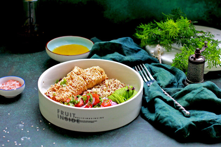 Собрать в миске или на блюде гарнир, салат, рыбу. Подавать, посыпав микрозеленью.