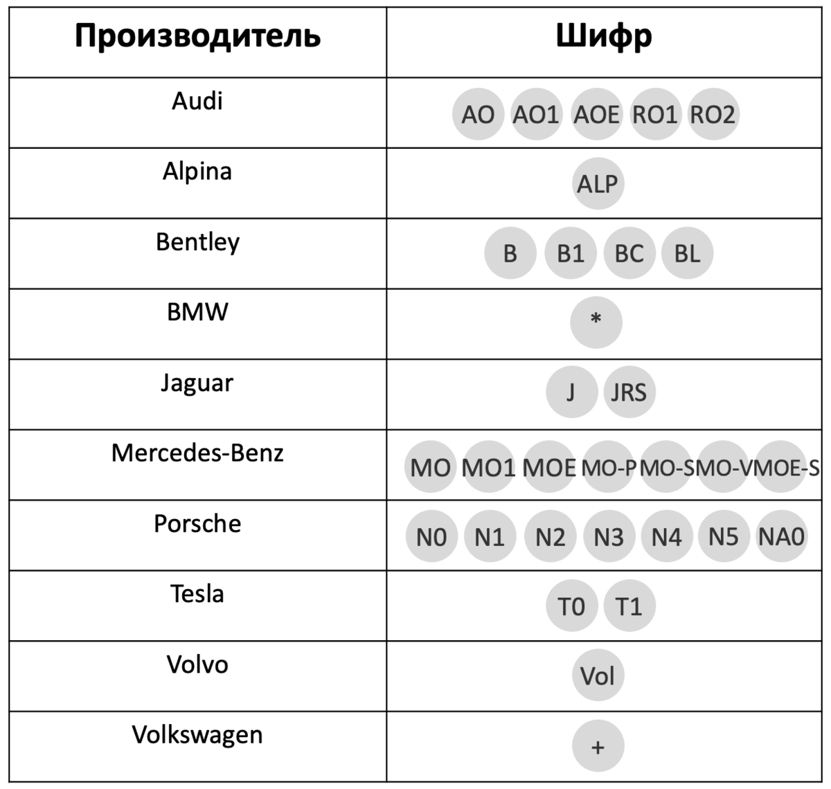 У каждого производителя есть свой "код", которым обозначаются омологированные шины. Примеры кодов можно увидеть ниже: