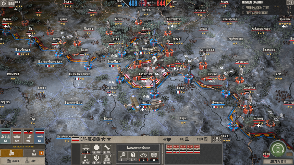 Собственно золото – первый ресурс в игре. Оно тратится на производство техники, строительство зданий в гексах (не буду на них останавливаться, они просто дают процентные бонусы к тем или иными показателям), автоматическое пополнение войск между сражениями и закупку дополнительных очков снабжения. Увеличить поступление золота можно с помощью технологий и выполнением побочных заданий из разряда «уничтожьте 5 пулеметных гнезд за 3 хода». Если золото тратится на стратегической карте, то снабжение – на тактической. Каждый корпус пехоты или батальон техники имеет свой запас снабжения (запас складывается, если в гексе размещено несколько фишек войск), необходимый для вызова войск, строительства укреплений и применения артиллерии и авиации, но обычно этого запаса недостаточно. Поэтому армии так же получают доступ к определенному запасу снабжения (его размер зависит от уровня построенного в этом гексе склада снабжения) из общего пула, который и отображается на стратегической карте. Если запас общего пула равен нулю, то и армии во время боя не смогут им пользоваться. Как сказал выше, запас снабжения можно увеличить, обменяв на него золото, при этом выгодность курса обмена улучшается технологиями. Второй вариант – все те же задания.