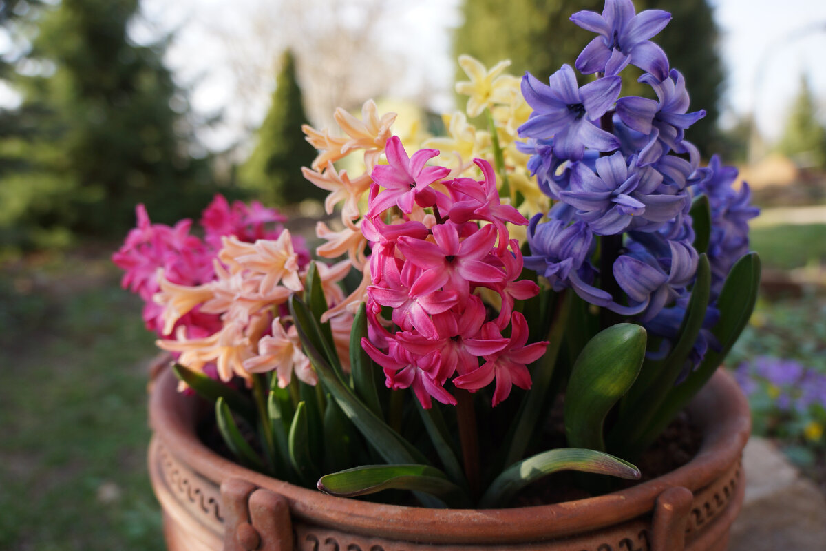 Чтобы гиацинты расцвели пораньше, одну из партий я посадила в горшок и отправила зимовать в погреб. Вот такими они были в марте, когда мы их достали из тёмного погреба. Чувствуя приближение весны и не зная морозов, луковки двинулись в рост гораздо раньше. Им не помешала полная темнота, хотя ориентиры их были заметно сбиты, листочки росли вкривь и вкось. Но на свету они быстро адаптировались и восстановились. Вот такими гиацинты стали 24 марта. В сравнении с ними, другая партия луковиц, которые находились в открытом грунте, только только показали свои листочки. Через две недели они подросли немного, погода резко поменялась, у нас сильно похолодало и поэтому цветочки не спешат распускаться. А гиацинты, что в горшке цветут и пахнут, да так пахнут, что ветерок гонят их сильный аромат во все уголки сада. В горшке луковки сидят тесно и дружно, как говорится в тесноте, да не в обиде. И поэтому букет выглядит пышным. Здесь собраны гиацинты за разные сезоны. Те что помоложе - пышные, набиты